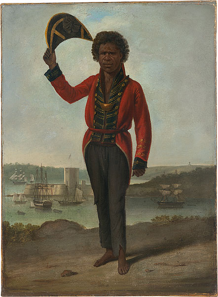 Augustus Earle (1793─1838), Portrait of Bungaree, a Native of New South Wales, with Fort Macquarie, Sydney Harbour, in Background c.1826, Rex Nan Kivell Collection, NLA.GOV.AU/NLA.CAT-VN313278 <>